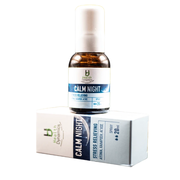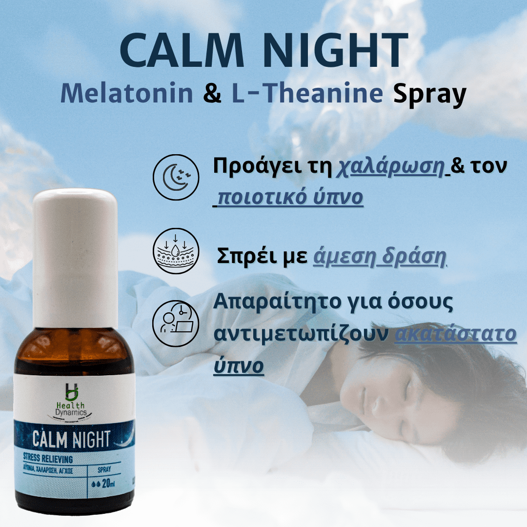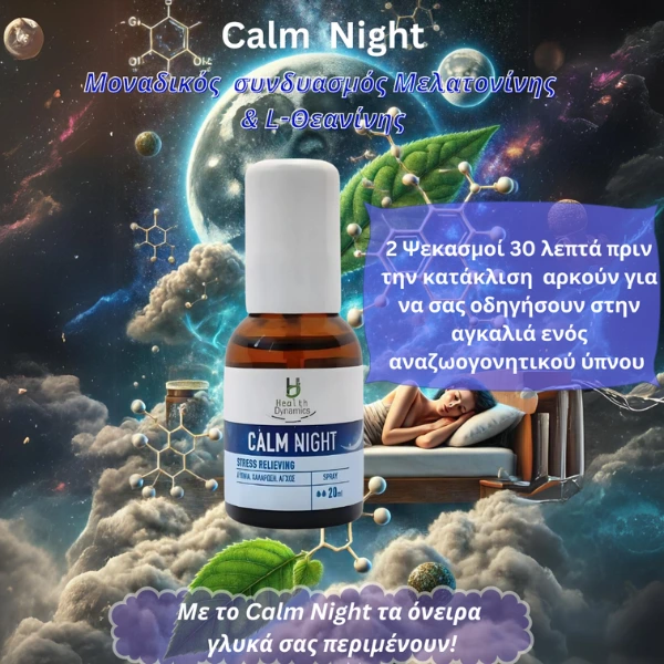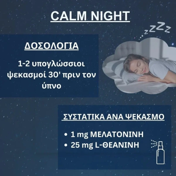 Το Calm Night είναι ένα καινοτόμο συμπλήρωμα διατροφής σε μορφή spray άμεσης απορρόφησης, που συνδυάζει την ορμόνη του ύπνου Μελατονίνη, με το αμινοξύ της χαλάρωσης, L-Θεανίνη για άμεση χαλάρωση & γρήγορη έλευση του ύπνου, αντιμετωπίζοντας δραστικά το πρόβλημα της αυπνίας. 1-2 Υπογλώσσιοι ψεκασμοί με το Το Calm Night  βοηθούν το σώμα και το μυαλό να χαλαρώσουν, να μειώσουν το στρες και να προετοιμαστούν για έναν ποιοτικό, βαθύ και ξεκούραστο ύπνο.