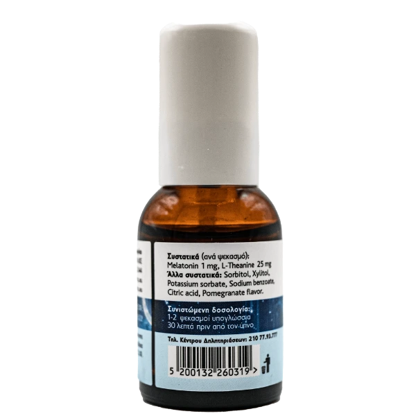 Μελατονίνη(1mg), L-Theanine(25mg), Sorbitol, Xylitol, Potassium sorbate, Sodium benzoate, Citric acid, Pomegranate flavour.